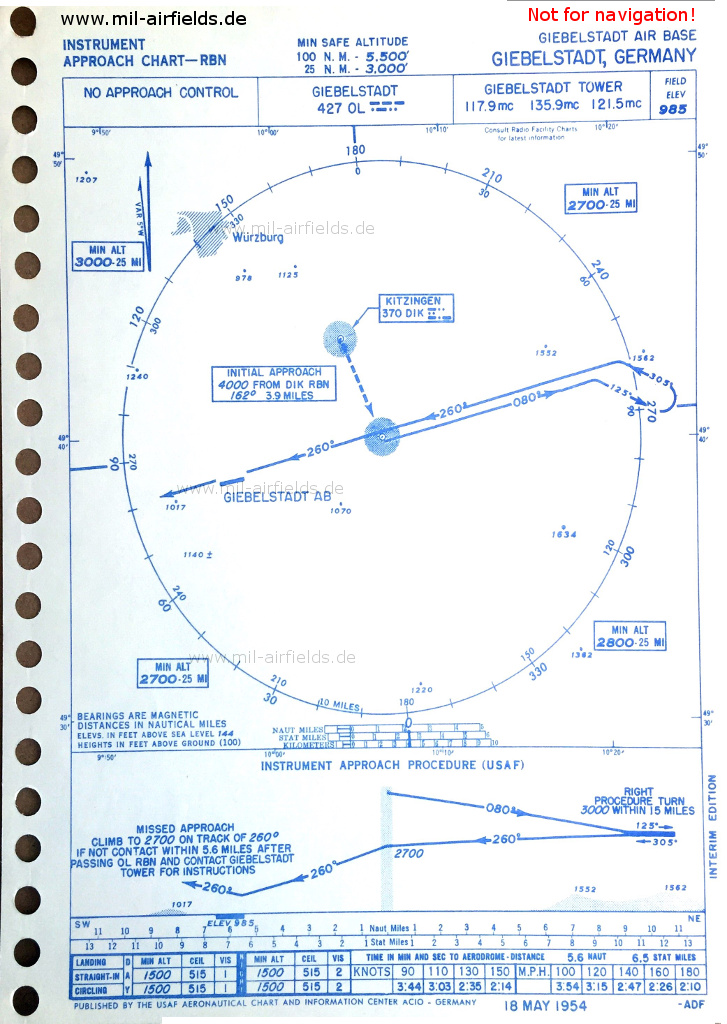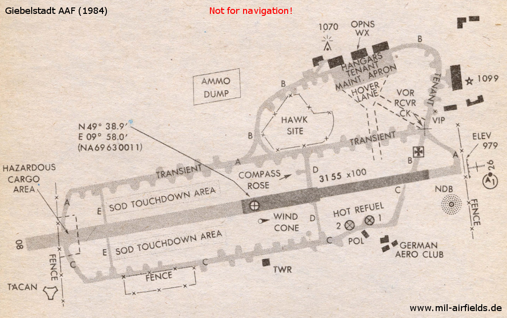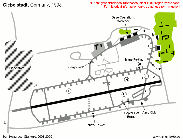 Für Giebelstadt wurde dokumentiert, dass das alte Rollfeld mit 2100 m x 600 m mit einer neuen Startbahn, Rollbahnen und Liegeplätzen überbaut ist. Die Flugbetriebsflächen einschließlich der Beton-Startbahn 08/26 mit 2100 m x 60 m befinden sich in einem guten Zustand. Ein "Erweiterungsstumpf" in Richtung Westen über die Straße Giebelstadt - Herchsheim mit 300 m x 50 m habe sich in Vorbereitung befunden. Die alten Anlagen seien mit Ausnahme von zwei Hallen und einigen Tankstellen zu einem großen Teil zerstört. Der ehemalige Unterkunftsbereich im Nordosten sei zu 90% gesprengt. Eine Erweiterung auf 3000 m sei nur nach Westen möglich, bei unerheblichen Erdbewegungen, aber mit der Notwendigkeit der Verlegung der B19 Giebelstadt-Herchsheim.