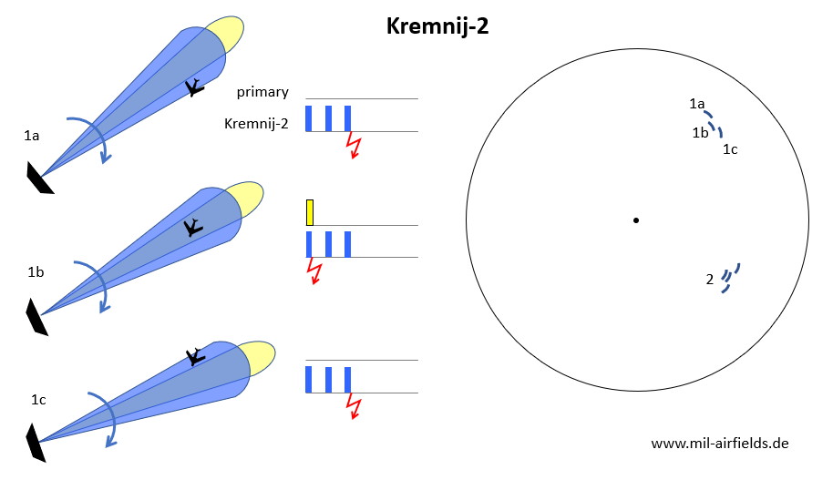 1a: Initially, the target is only hit by the wider Kremnij interrogation lobe. The transponder on board responds after receiving the third impule.